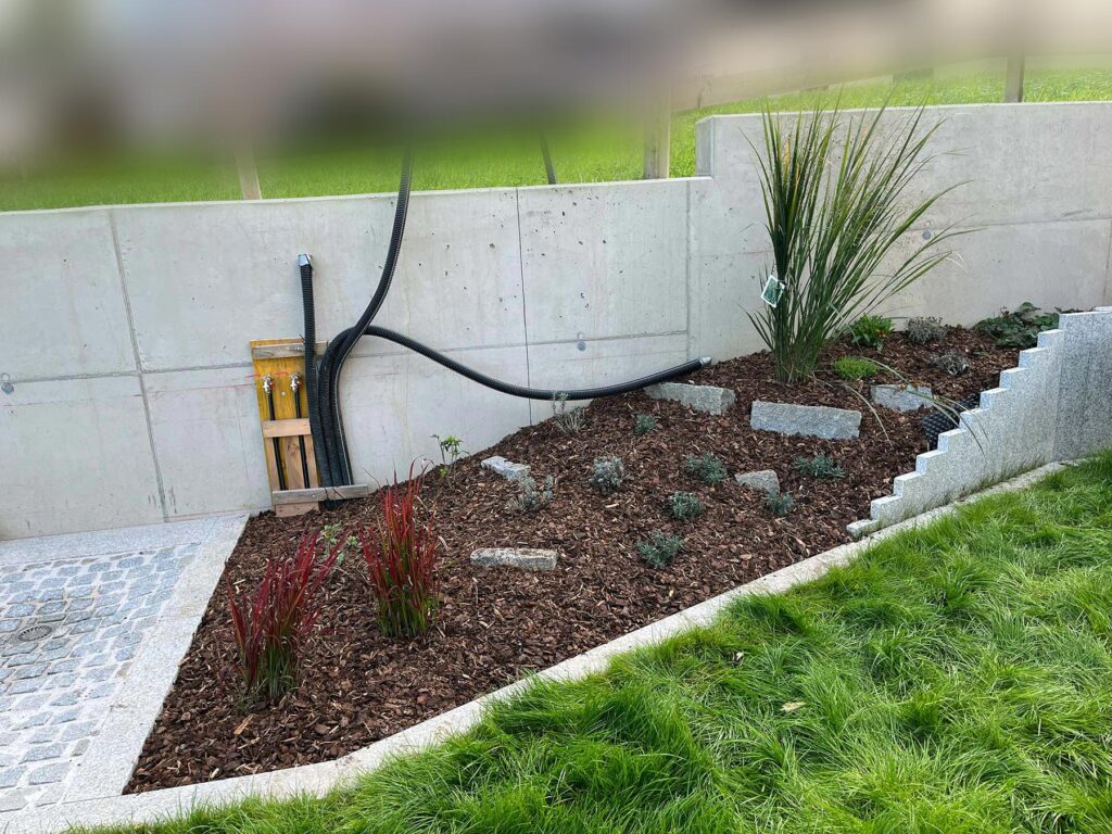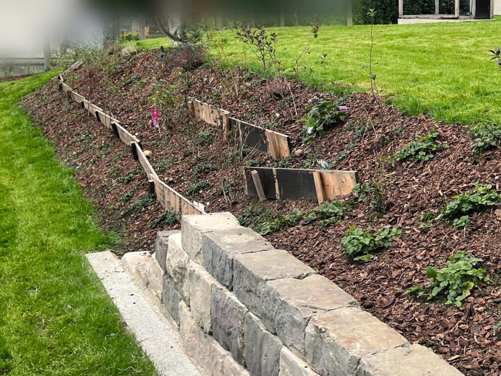 🧱 Abrutschsicherung: Bei schrägen Flächen rutscht der Rindenmulch schnell weg – spätestens beim ersten Regenschauer. In dem Fall können Steine (zB Granitsteine) oder Holzbretter als Abrutschsicherung verwendet werden.